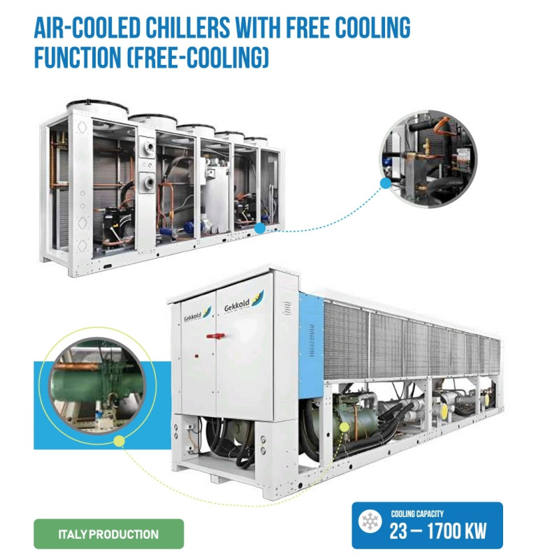 Gekko Air FC this is new line of equipment air cooled chillers with screw compressors and free cooling coil.