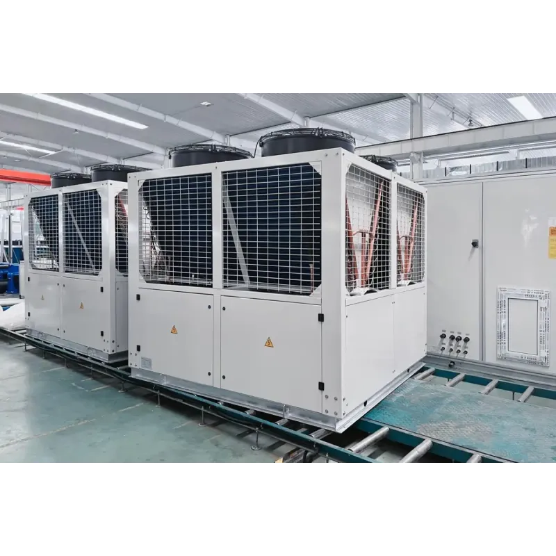 Chillers has cooling capacity of every module from 68 kw to 145kw. Maximum cooling capacity of 6 modules is 994 kw. All model of the chillers are equipped shell and tube evaporator, scroll compressors and condenser which made by copper pipes and aluminum fins. All models of the chiller are made by factory, with certificate ISO 9001. Chillers can work with ambient temperature from -25⁰C to +35⁰C. All chillers are tested by factory at special testing zone before shipment.